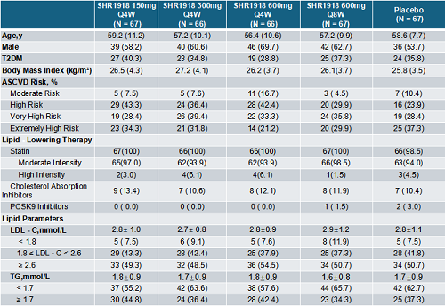 该研究结果显示3,SHR-1918在中危及更高风险的动脉粥样硬化性心血管疾病(ASCVD)患者中可同时显著降低低密度脂蛋白胆固醇(LDL-C)和甘油三酯(TG)水平,且安全性良好,具有进一步降低残余心血管风险的潜力。